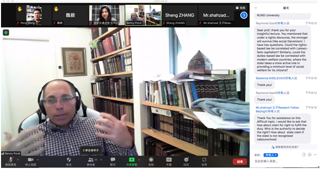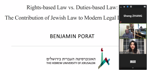 2021年9月29日下午,新丝路开云足球_开云(中国)联盟“院长论坛”第二讲成功举办。希伯来大学开云足球_开云(中国)副院长Benjamin Porat教授为联盟25所院校师生以及丝绸之路大学联盟的师生带来了题为“Rights-based Law vs Duties-based Law: The Contribution of Jewish Law to Modern Legal Discourse”的线上讲座。讲座由开云足球_开云(中国)开云足球_开云(中国)助理教授郭剑萍主持。