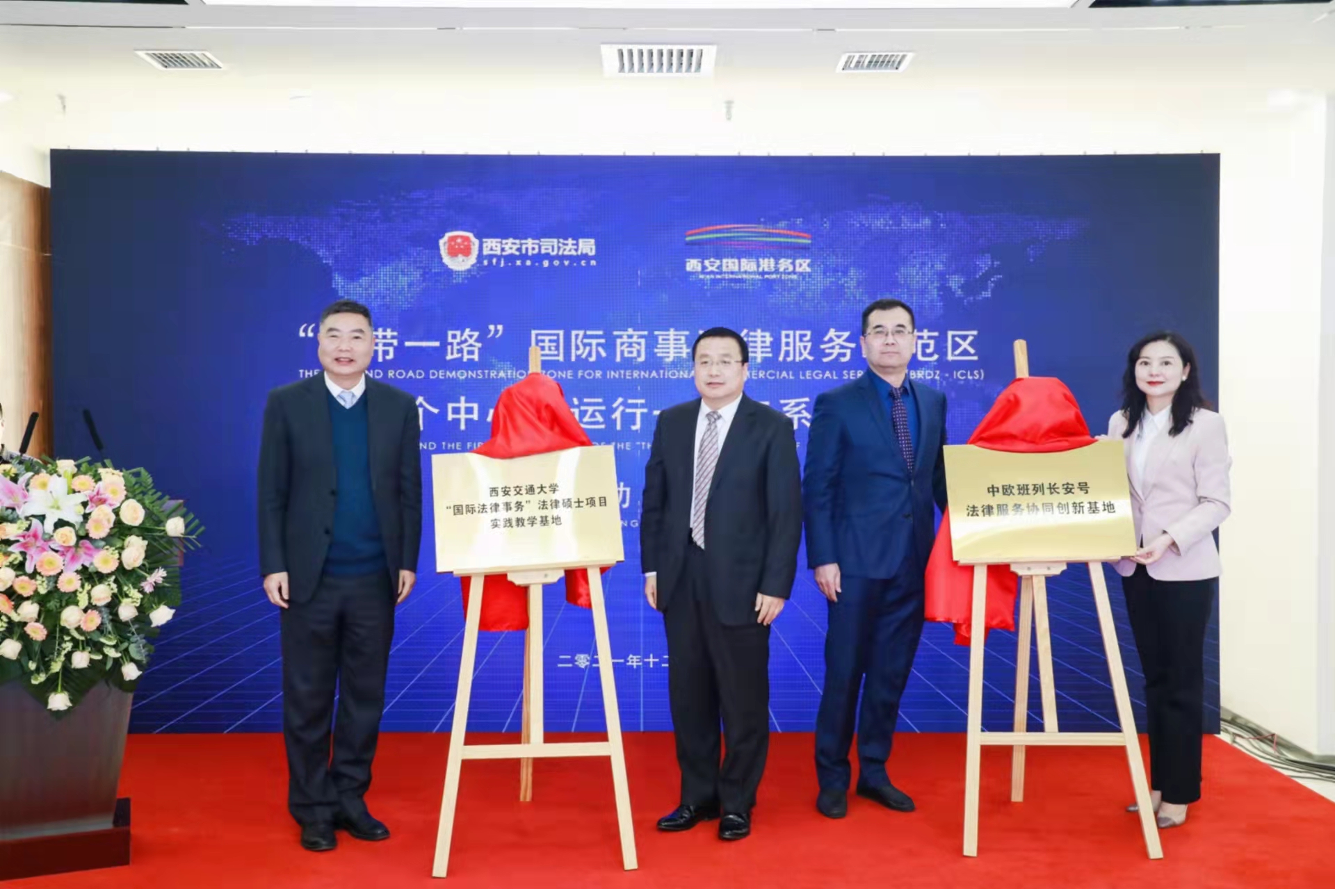 启动仪式上,西安市司法局相关负责人宣读了关于设立西安市国际商事法律服务中心等机构的批复,并发布了西安市涉外法律服务人才培养“引领计划”和西安市加快涉外法律服务业有关奖补政策。随后分别为开云足球_开云(中国)“国际法律事务”法律硕士项目实践教学基地、西北政法大学法律硕士(涉外律师)人才培养项目实践实训教学基地、西安财经大学开云足球_开云(中国)实习实践基地以及“中欧班列长安号法律服务”协同创新基地、西安市国际商事法律服务中心进行了揭牌。