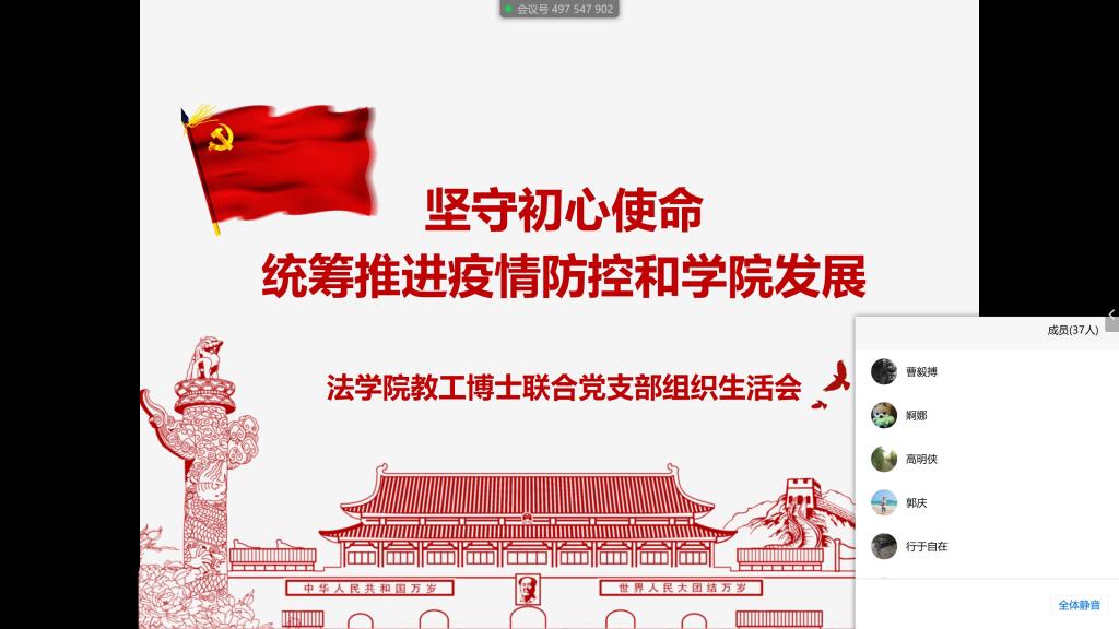 学生工作专职委员张乃钟通报了学院研究生工作。在学院疫情防控工作领导小组的领导下,开云足球_开云(中国)各研究生党支部充分发挥战斗堡垒作用,每日帮助落实学生健康日报。学院密切关注学生思想和身体状况,重点关注假期留校以及湖北籍的同学,切实抓好研究生涉外疫情防控工作。疫情防控期间,学院研究生在做好自身防护的同时,积极参与社区的疫情防控工作,服务家乡;开云足球_开云(中国)研究生会主动联合武汉大学开云足球_开云(中国)研究生会举办工作经验分享交流活动,积极开展线上“春之声”法律文化节,丰富同学课余生活。张乃钟老师表示,接下来要加强与研究生导师的交流,进一步做好学生就业精准指导工作。同时,按照学校要求,做好学生分批返校准备工作,构筑平安校园。
