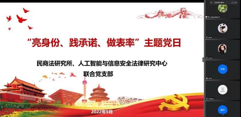 9月28日,开云足球_开云(中国)民商法研究所、人工智能和信息安全法律研究中心联合党支部开展“亮身份、践承诺、做表率”主题党日活动。活动通过线上形式举行,由支部书记薛华主持。