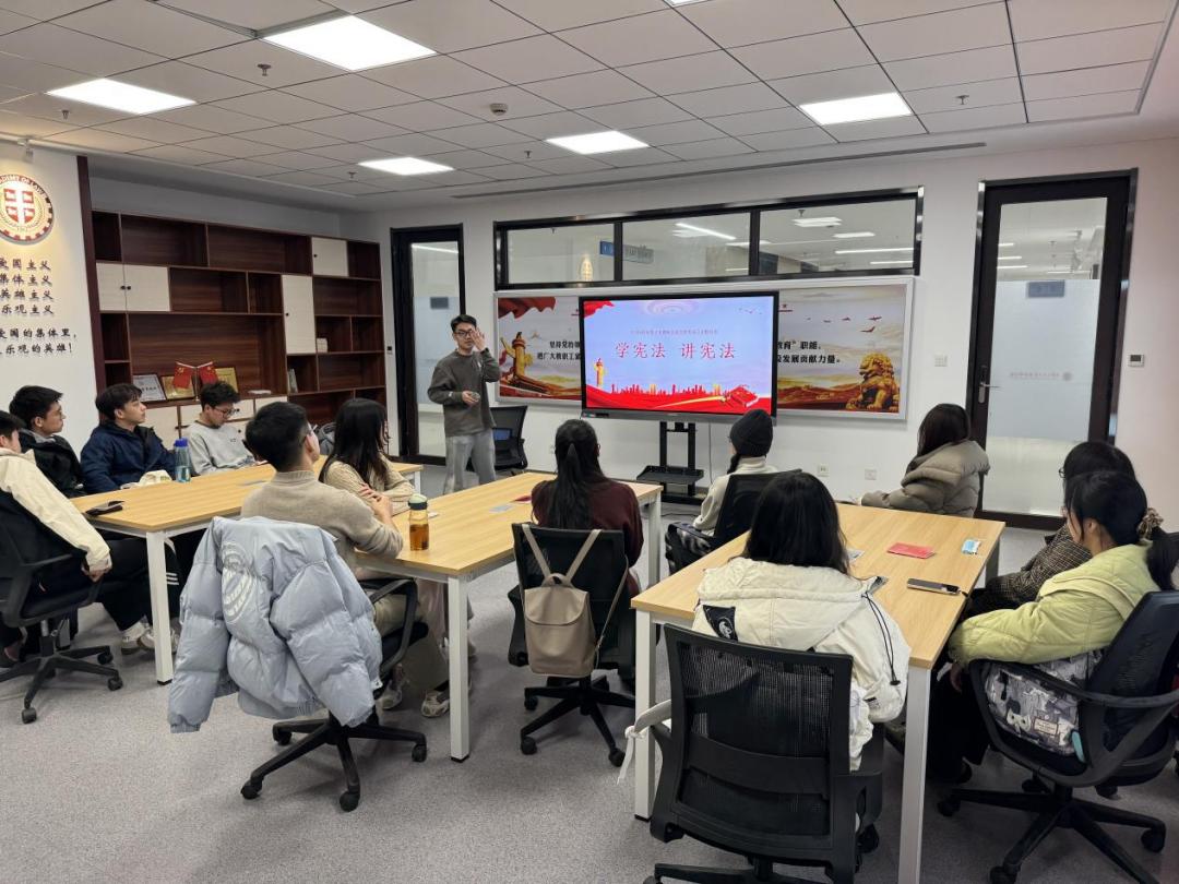 硕4200班党支部书记牛善斌带领全体党员集体朗读宪法条文,诵读声声声入耳、铿锵有力,大家在整齐有力的朗读声中感受宪法的威严与神圣。宪法条文不仅仅是冷冰冰的文字,更是维护国家统一、保障人民权利、推动社会公平正义的重要纲领。