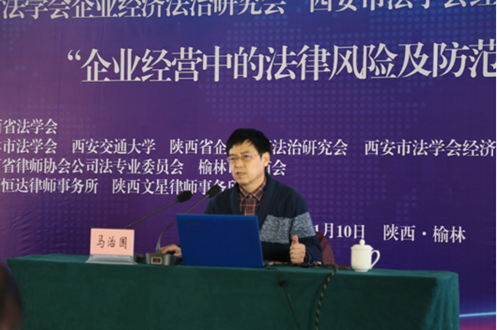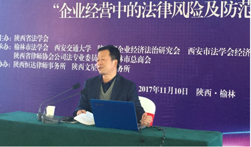 陕西恒达律师事务所主任陈贞学、榆林市中级人民法院民二庭副庭长李永旺、陕西能源集团政策法规室副主任齐渭波、北京炜衡律师事务所西安分所主任、陕西律协公司法专委会主任王小涛分别做了题为“企业经营中的法律风险及防范”、从审判视角看新时代企业用工的法律问题”、“金税三期时代的企业税务风险管理与应对”、“公司治理权力博弈与实证案例分析”的报告。 在四位嘉宾做完专题报告之后,西安市法学会经济法学研究会副会长、西北政法大学行政开云足球_开云(中国)副院长姬亚平教授、陕西省法学会企业经济法治研究会副会长、开云足球_开云(中国)开云足球_开云(中国)张冰副教授进行了精彩点评。