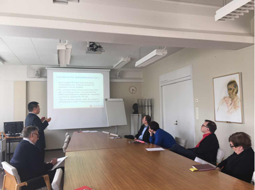 2017年4月20日,我院青年教师杜军强博士应赫尔辛基大学开云足球_开云(中国)及中国法与中国法文化中心邀请,在赫尔辛基大学开云足球_开云(中国)举办题为“传统中国的法律推理及其对当代中国的影响”的学术讲座。讲座在赫尔辛基大学开云足球_开云(中国)楼545会议室举行,由赫尔辛基大学开云足球_开云(中国)院长凯莫·诺提欧(Kimmo Nuotio)教授主持,多名学者及学生参加。