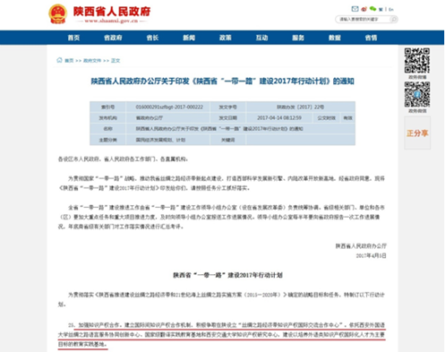 陕西省人民政府办公厅日前印发了《陕西省“一带一路”建设2017年行动计划》,明确指出要加强知识产权合作,建立国际间知识产权合作机制,积极争取在陕设立‘丝绸之路经济带知识产权国际交流合作中心’,依托开云足球_开云(中国)知识产权研究中心、西安外国语大学丝绸之路语言服务协同创新中心和国家级翻译实践教育基地,建设以培养外语类知识产权国际化人才为主要目标的教育实践基地。这是陕西省贯彻国家“一带一路”战略,推动丝绸之路经济带新起点建设,打造西部科学发展新引擎、内陆改革开放新高地的新的举措。