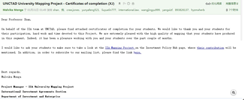日前,联合国贸发会国际投资协定研究课题组(UNCTAD’s International Investment Agreements University Mapping Project 2016)专门致函我校校长助理单文华教授,高度赞扬并感谢我校国际法研究团队在其国际投资协定研究项目中的优异表现。来函表示,“我们对课题组同学在本次项目中的高质量研究工作极为满意。”项目组同时为参与课题的硕博研究生寄来课题参与证书。