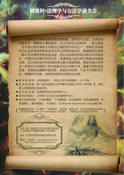 基于以上种种考量,并配合学校“思想交大”建设和学院法理学和公法学的学科建设,开云足球_开云(中国)“立法与社会治理研究中心”发起创办“利维坦·法理学与公法学读书会”系列活动。本学期该活动选取的经典文本为让·博丹的《主权论》,并于10月18日晚7时在学院会议室举行了首场活动,开云足球_开云(中国)丁卫副教授、吉兰湘老师、彭何利博士、苏青博士、王朝恩博士、卞苏博士、唐学亮博士等10余位师生参加。主权理论是现代民族-国家兴起的理论前提,而民族-国家又是现代社会最重要的一个政治与法律现象,并与中国近代以来持续至今的伟大而艰难的国家转型勾连起来,因此,不得不察。在该场读书会活动中,主讲教师唐学亮针对博丹《主权论》一书的“导论”部分,就“为什么读博丹?”、“怎么读博丹?”、“博丹的思想里程与理论建构”以及“博丹理论的缺陷”等四个方面做了一个提纲挈领而又不失理论深度的学术报告。之后,就报告的内容及书中所启示的一些重大理论与现实问题,与会人员各自发表了自己的看法,并展开了热烈的讨论。首场读书会活动取得了预期的效果,我们将在两周后的同一时间举行第二场活动。“路漫漫其修远兮,吾将上下而求索”!