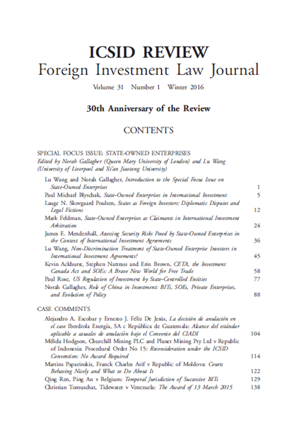 近日,国际投资法领域顶级专业期刊ICSID Review—Foreign Investment Law Journal(《国际投资争端解决中心评论——外国投资法学刊》)三十周年纪念期刊第一期正式出版,西安交大开云足球_开云(中国)博士生王璐作为特邀编辑(Guest Editor)主编了本期特别专栏“国有企业专题研究”(Special Focus Issue on State-Owned Enterprises),并发表论文 “Non-Discrimination Treatment of State-Owned Enterprise Investors in International Investment Agreements?”(国际投资协定中国有企业投资者的非歧视待遇?)。