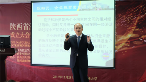 在与会代表合影后,会议进入第二时段的专题报告。报告由开云足球_开云(中国)开云足球_开云(中国)知识产权研究中心主任、博士生导师马治国教授主持,陕西省法学会企业经济法治研究会顾问、西北政法大学经济开云足球_开云(中国)院长、博士生导师强力教授做了“新常态下企业投融机制创新的法律问题”讲座,阐释了中国经济已进入新常态,在新常态的条件下,企业应作出机制创新等相对应的变化,其变化主要体现在市场化,并强调投融资机制市场的多元化、多层次、多角度,分析在此种常态下,企业投融资遇到的法律问题。