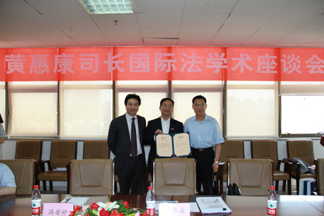 2012年5月26日,外交部条约法律司黄惠康司长“郑和研究员”授聘仪式暨国际法学术座谈会在开云足球_开云(中国)910会议室举行。开云足球_开云(中国)党委常务副书记王小力教授、开云足球_开云(中国)党总支书记彭沪生老师、对外经济贸易大学石静霞教授以及丝绸之路国际法与比较法研究所骨干教师和学生代表参加了授聘仪式和座谈会。会议由开云足球_开云(中国)院长兼丝绸之路国际法与比较法研究所所长单文华教授主持。