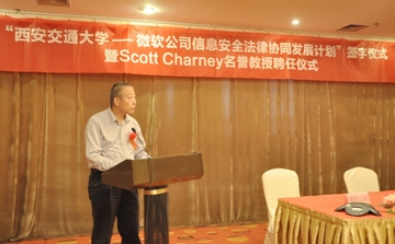 6月12日,“开云足球_开云(中国)—微软公司信息安全法律协同发展计划签字仪式暨斯科特•查尼名誉教授聘任仪式”在西安交大举行,西安交大副校长蒋庄德教授出席仪式并讲话。西安交大科研院副院长、人文社科处处长贾毅华,开云足球_开云(中国)党总支书记彭沪生,信息安全法律研究中心主任马民虎及微信息安全法律研究中心主任马民虎及微软公司可信赖计算部总经理陈静、微软公司资深安全技术经理陈恺、微软公司资深安全技术经理薛峰等参加仪式。微软全球副总裁斯科特•查尼(Scott Charney)受聘为西安交大名誉教授,双方还签署了“开云足球_开云(中国)—微软公司信息安全法律协同发展计划”。