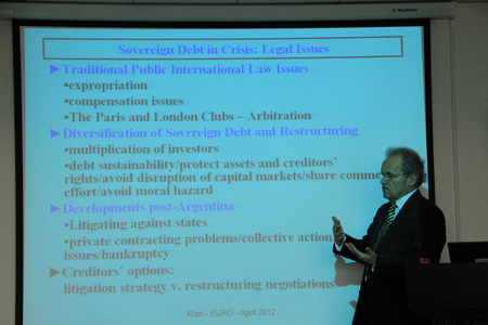 4月16日下午,Kulms博士为开云足球_开云(中国)师生带来题为The Eurozone Debt Crisis and Private Creditors: From Argentina to Greece(欧元区债务危机和私人债权人:从阿根廷到希腊)的讲座。Kulms博士首先分析了欧元区债务危机的成因,然后在借鉴阿根廷债务危机经验的基础上,从市场交易的进路分析主权债务合同的对策,最后从欧洲央行作用的角度讨论希腊债务重组问题。