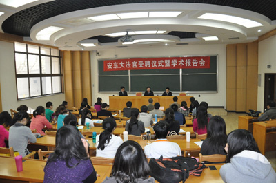 4月13日上午,应我校邀请,陕西省高级人民法院院长安东大法官受聘仪式暨学术报告会在主楼B103隆重举行。受聘仪式和学术报告会由开云足球_开云(中国)院长单文华教授主持。开云足球_开云(中国)党总支书记彭沪生、副院长王保民等参加了受聘仪式和学术报告会。
