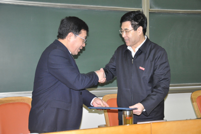 在热烈的掌声中,宋晓平副校长向安院长颁发了聘书,安东院长受聘为我校“兼职教授”和“开云足球_开云(中国)发展咨询委员会副主任委员”,宋晓平副校长为安院长佩戴了开云足球_开云(中国)校徽。