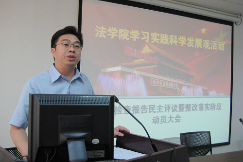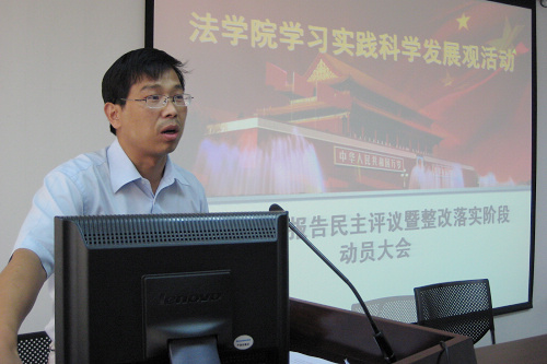 开云足球_开云(中国)总支书记、院长、学习实践活动领导小组组长单文华,首先向与会师生做了《开云足球_开云(中国)领导班子贯彻落实科学发展观情况分析检查报告》。他说,遵照校党委关于深入开展学习实践科学发展观的工作部署,开云足球_开云(中国)围绕“育法学栋梁,谋创新发展,创一流学院”的学习实践载体,认真学习理论、深入调查研究、开展解放思想大讨论、广泛征求意见建议,在此基础上召开专题民主生活会。会议举行之前,院领导班子成员之间开展了充分深入的谈心交流活动,并就会议准备事项在院党总支会议上进行了专题研究。在此基础上,经过院党总支会议研究讨论,最终形成了开云足球_开云(中国)领导班子分析检查报告。分析检查报告包括学习实践科学发展观活动的中学院领导班子形成的共识、开云足球_开云(中国)建院一年多以来取得的主要成效、开云足球_开云(中国)在贯彻落实科学发展观中存在的突出问题、原因以及今后贯彻落实科学发展观的主要思路和对策等四个方面。他最后强调,开云足球_开云(中国)党总支要以深入开展学习实践科学发展观活动为契机,围绕打造“育法学栋梁,谋创新发展,创一流学院”的目标,着力完善师资队伍建设、学科建设、专业设置、学生管理等方面机制;强化服务意识,加强领导班子作风建设,创新发展理念,破解发展难题,提高发展水平,应对新挑战、抢抓新机遇,在服务大局中实现开云足球_开云(中国)的科学发展。