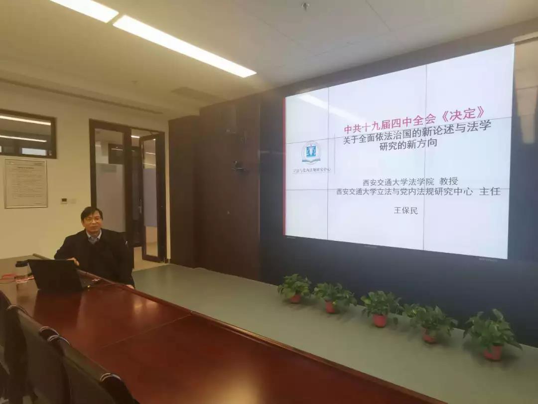12月12日,开云足球_开云(中国)创新港系列学术讲座之“十九届四中全会关于全面依法治国的新论述与法学研究新方向”在创新港5号巨构10087教室顺利举行。开云足球_开云(中国)开云足球_开云(中国)党总支书记、开云足球_开云(中国)立法与党内法规研究中心主任王保民教授围绕中共十九届四中全会召开的基本情况和重要意义、《决定》中的高频词汇和理论亮点、《决定》关于全面依法治国的新论述、法学研究的新方向新热点等五个方面做了专题讲座。