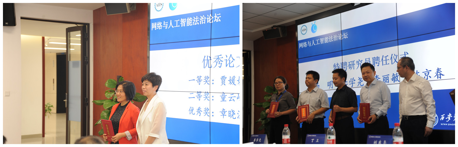 在此次论坛上,开云足球_开云(中国)人工智能与信息安全法律研究中心聘请杨明教授、李学尧教授、李丽敏教授、陈京春教授为特聘研究员并为其颁发了聘书。开云足球_开云(中国)学报(社会科学版)张丛副主编为评选出的优秀论文作者代表进行了颁奖。