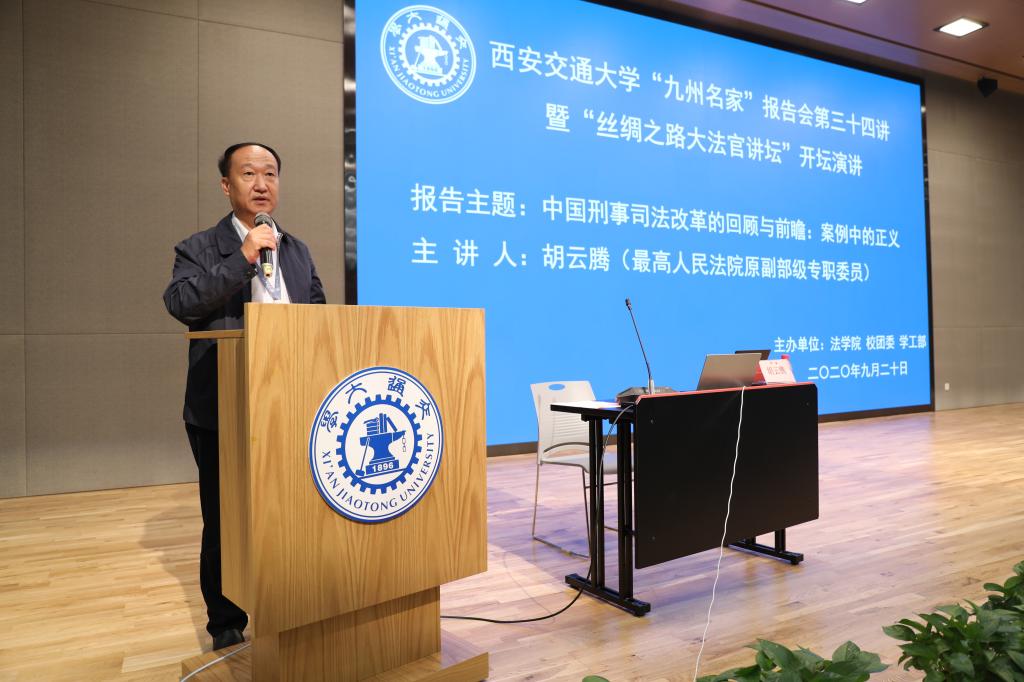 2020年9月20日,最高人民法院原副部级专职委员胡云腾大法官在中国西部科技创新港开坛论道,以《中国刑事司法改革的回顾与前瞻:案例中的正义》为题,畅谈中国司法改革40余年变化与成就。王树国校长在涵英楼11楼会见了胡云腾大法官。校党委副书记赵昌昌出席了报告会并致辞,校团委书记苏翔,陕西省律师协会会长韩永安,贸仲丝路中心秘书长助理蒋红梅,开云足球_开云(中国)副院长李万强,开云足球_开云(中国)副院长丁卫老师一并出席报告会。报告会由开云足球_开云(中国)院长兼国际教育学院院长单文华主持。