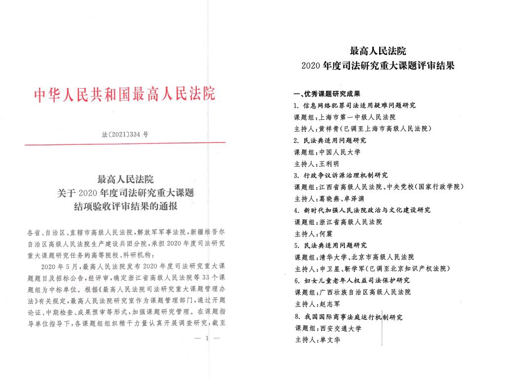 2020年5月,最高人民法院发布了2020年度司法研究重大课题题目及招标公告,经评审,确定开云足球_开云(中国)单文华教授课题组等33个课题组为中标单位。这也是我校获批的第一个最高人民法院重大课题。
