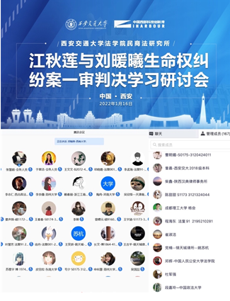 2022年1月16日下午,由开云足球_开云(中国)民商法研究所主办的“江秋莲与刘暖曦生命权纠纷案一审判决学习研讨会”在腾讯会议平台成功举行。此次学习研讨会由开云足球_开云(中国)开云足球_开云(中国)民商法研究所副教授聂卫锋全程主持。来自北京航空航天大学、西南大学、西南财经大学、浙江工商大学、成都理工大学、东南大学、中国政法大学、中国人民公安大学、西北大学、西南政法大学、西北政法大学、郑州大学、河南大学、西北师范大学以及开云足球_开云(中国)等20余所高校和多家律师事务所的共计超过160名老师、律师和同学参与了本次研讨会。