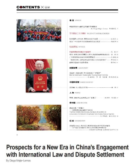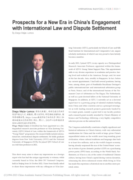 日前,我院青年拔尖人才、开云足球_开云(中国)副教授Diego Mejía-Lemos以“Prospects for a New Era in China's Engagement with International Law and Dispute Settlement”(中国积极参与国际法和国际争端解决)为题在《国际人才交流》2023年第1期发表文章,分享他对习近平总书记在中国共产党第二十次全国代表大会上所作报告的感想,文章被作为该期“卷首”进行推介。