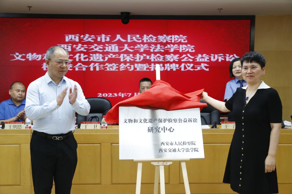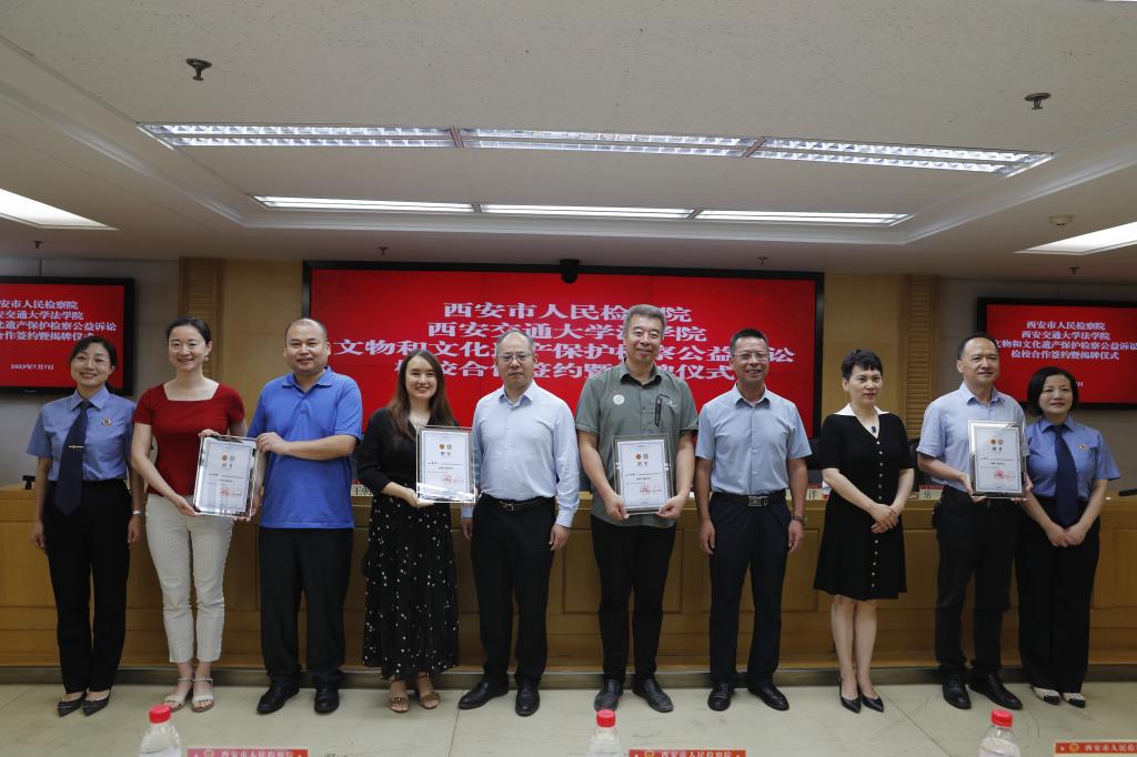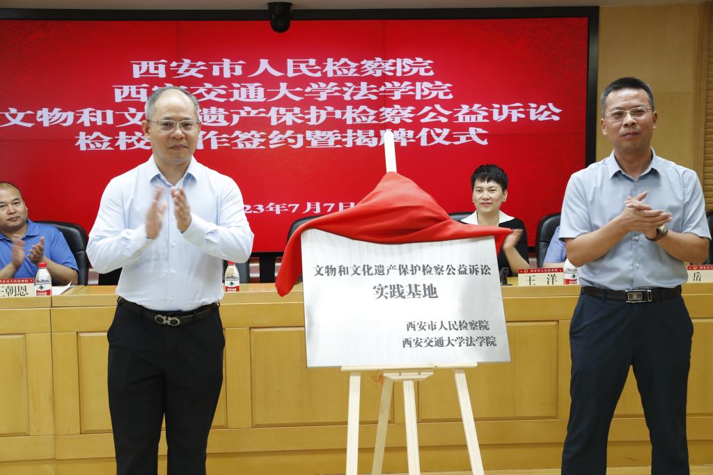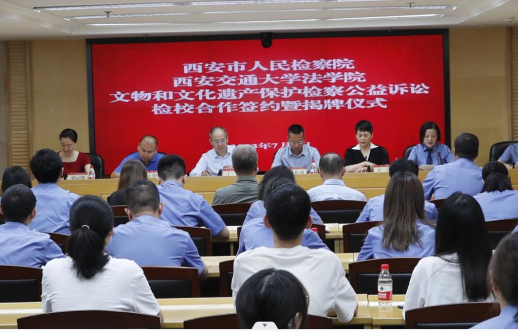 7月7日,西安市人民检察院、开云足球_开云(中国)开云足球_开云(中国)共同举办“文物和文化遗产保护检察公益诉讼”检校合作签约暨揭牌仪式。陕西省人民检察院第八检察部主任王洋、西安市人民检察院副检察长韩柏超等领导,西安市人民检察院第八检察部全体干警、各区县院分管副检察长、公益诉讼部门负责人及实务研究员、开云足球_开云(中国)开云足球_开云(中国)副院长丁卫、开云足球_开云(中国)开云足球_开云(中国)的王朝恩研究员、刘丽娜副教授、特聘专家研究员代表以及西交大开云足球_开云(中国)首批11名实习生出席仪式。