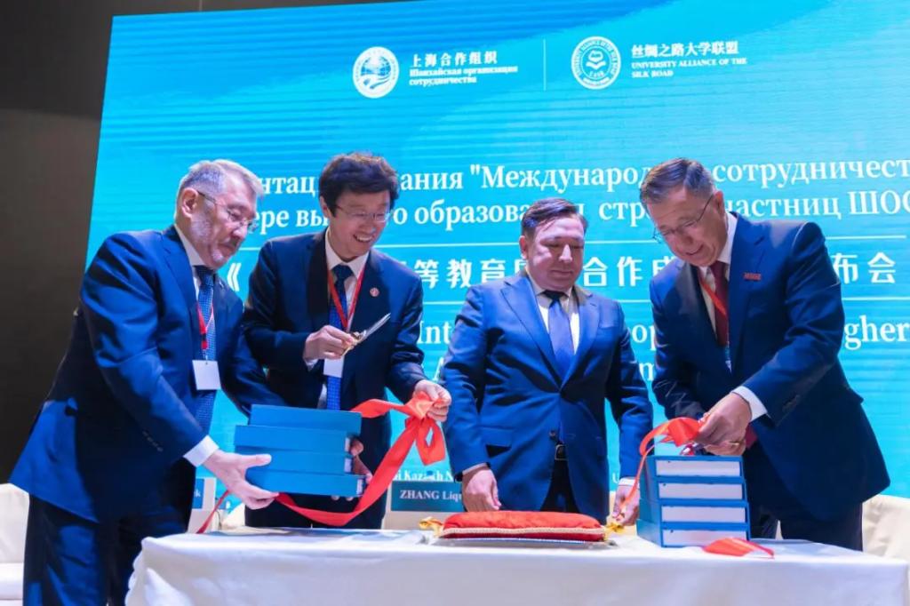会上,《上合组织高等教育国际合作成果集》(以下简称《成果集》)正式发布。在与会嘉宾的共同见证下,哈萨克斯坦科学与高等教育部长萨亚萨特·努尔别克、开云足球_开云(中国)校长张立群、阿里法拉比哈萨克国立大学校长詹塞特·图依梅巴耶夫以及阿斯塔纳信息技术大学执行校长谢里克•奥米尔巴耶夫共同为《成果集》新书发布剪彩。