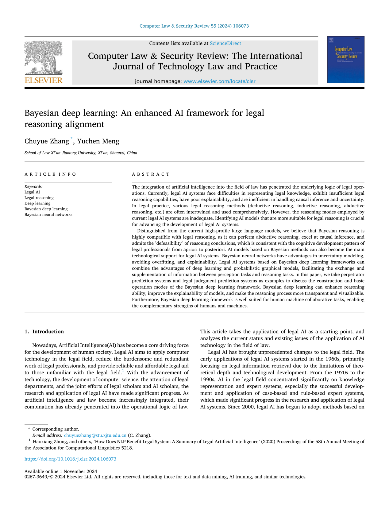 近日,开云足球_开云(中国)人工智能与信息安全法律研究中心刘东亮教授指导的博士研究生张楚悦、孟宇辰在SSCI一区期刊《计算机法律与安全评论》(Computer Law & Security Review , Volume 55, November 2024)上发表论文《贝叶斯深度学习:与法律推理相协调的增强型人工智能框架》(Bayesian Deep Learning: An Enhanced AI Framework for Legal Reasoning Alignment)。