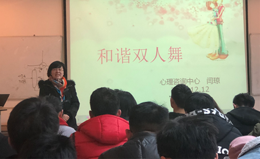 接着,老师开始讲解本次讲座的主要内容。开场时,闫老师就“爱究竟是什么?”这个问题跟同学们展开了积极互动,引发了同学们的热烈讨论。紧接着,老师从恋爱篇和婚姻篇两部分内容展开了分析:在恋爱篇中,闫老师以提问的方式引导同学们思索“我爱谁”、“为什么要恋爱”、“爱的目的”、“爱如何表达及如何拒绝”、“如何面对失恋”等问题,并通过比较男生和女生思维方式差异性的方式,列出了一系列交往,沟通的注意事项。在婚姻篇中,闫老师对“为什么要结婚”、“择偶的标准及考虑因素”进行了讲解。