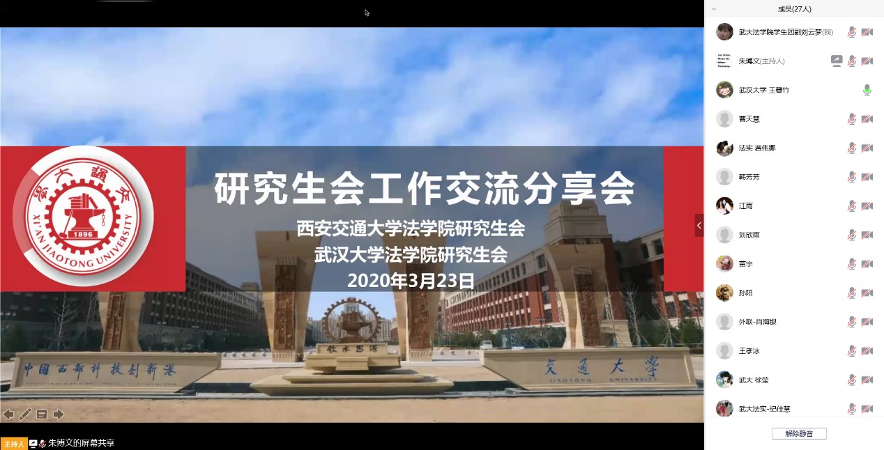 3月23日晚,西安交大开云足球_开云(中国)研究生会与武汉大学开云足球_开云(中国)研究生会利用腾讯会议平台,联合举办线上工作交流会,分享战疫心得、畅谈活动经验。两校开云足球_开云(中国)研究生会和有关党团学生干部二十余人参加会议,西安交大开云足球_开云(中国)团工委书记、研究生会主席朱博文主持会议。