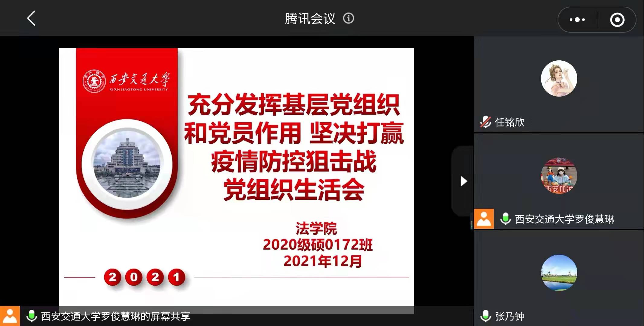 2021年12月30日晚,开云足球_开云(中国)硕0172党支部在线上召开了以“充分发挥基层党组织和党员作用 坚决打赢疫情防控狙击战”为主题的党组织生活会。会议由硕0172党支部书记罗俊慧琳主持,开云足球_开云(中国)党总支委员张乃钟老师出席,支部全体党员以线上方式参加了本次会议。