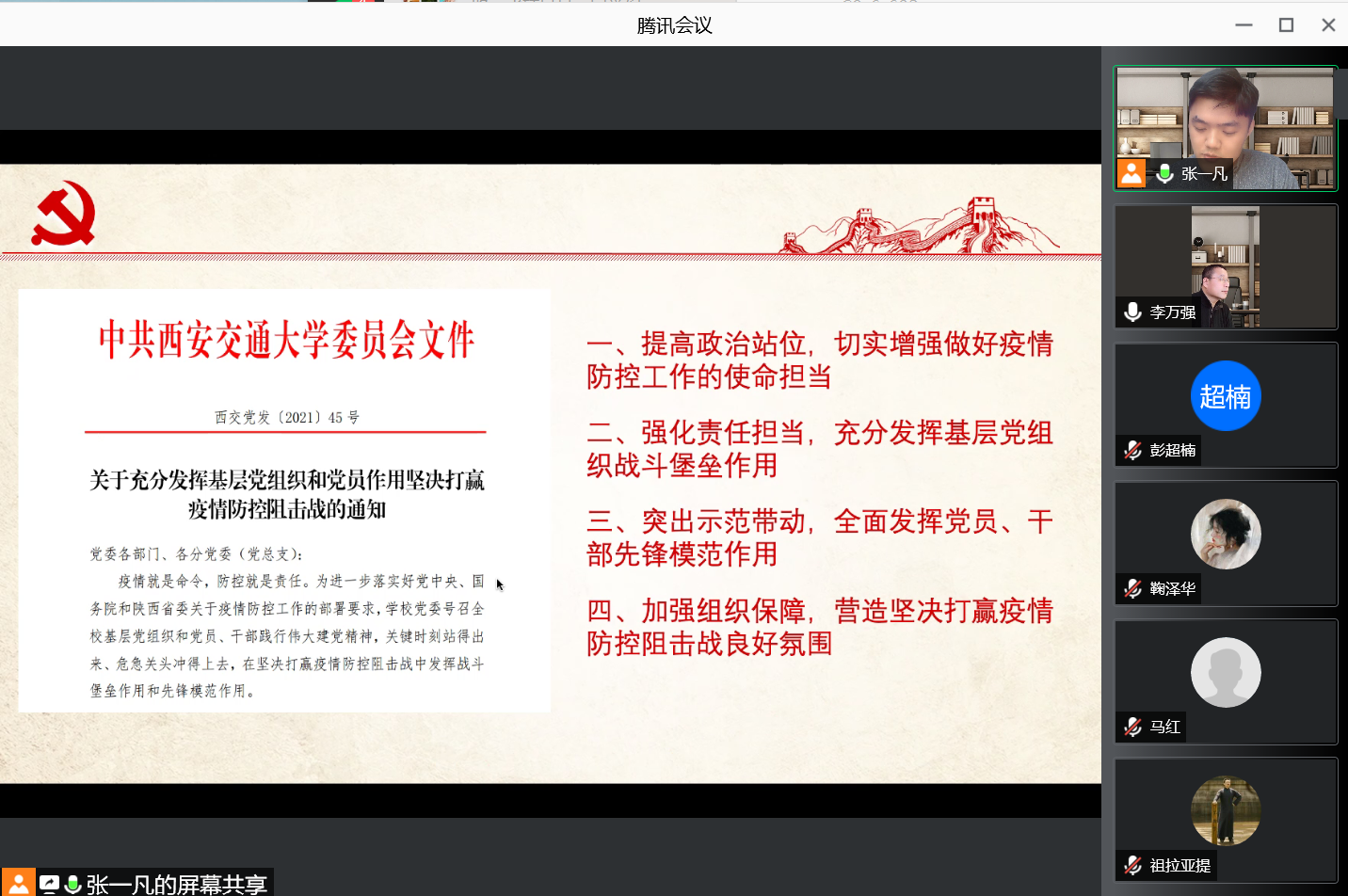 12月31日上午,开云足球_开云(中国)硕1173党支部召开线上组织生活会,深入学习落实上级党委关于疫情防控的相关文件精神。党支部成员及入党积极分子代表共计15人参与本次会议,开云足球_开云(中国)副院长李万强教授出席。会议由党支部书记张一凡主持。