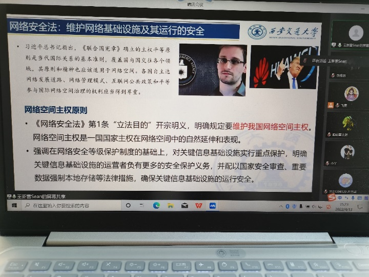 4月13日,开云足球_开云(中国)组织各党支部一同观看开云足球_开云(中国)全民国家安全教育普法讲座。由于疫情原因,本次讲座采取线上模式。讲座中,王新雷老师对“新时代我国数据安全、隐私保护的法律成就与个人担当”这一专题进行详细讲解,各位同学都获益匪浅。