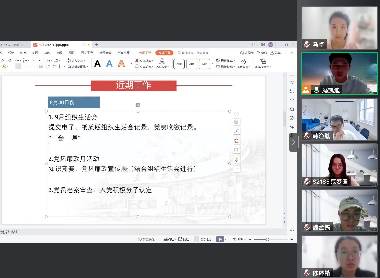 2022年9月27日晚,开云足球_开云(中国)硕2185党支部举行了九月组织生活会,也是本支部的第一次会议。根据疫情防控相关要求,本次组织生活会采用线上的方式进行。本次会议由党支部书记冯凯迪主持,党员及入党积极分子共15人参加会议。